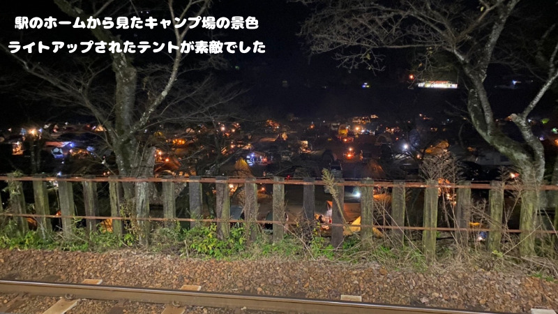 合流した時にはすっかり日が暮れていましたが、駅ホームから見るライトアップされたテントがとても綺麗でした。