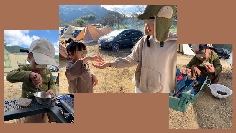 家ではケンカばかりの珍獣たちもキャンプ場では、一緒に虫を捕まえたり、石を集めては積んだりしながら遊んでいました。