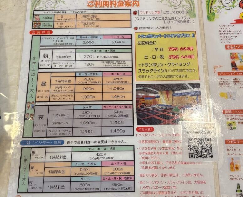 非会員(ビジター)・トランポリン利用・ドリンクバー付きの3時間コースを利用して、合計金額は約8,420円でした。