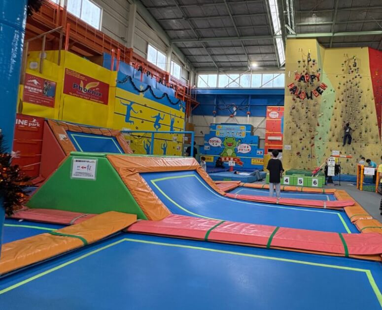 名物のトランポリンエリアボルダリングスラックラインのほか、バスケットボール・テニス・卓球・バドミントンなどのスポーツエリアも充実!