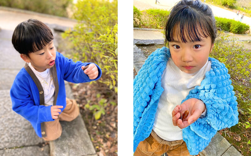 我が子たちはどんぐりや松ぼっくりを集めたりして遊んでいます。